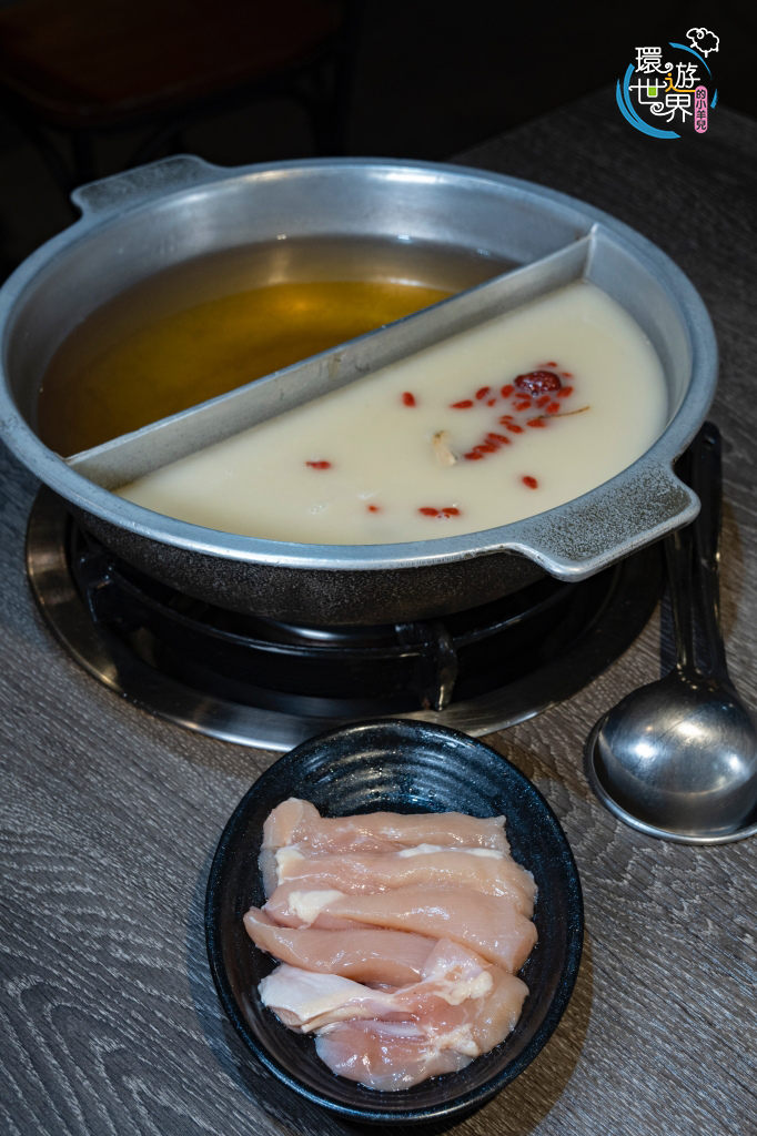 新鮮豬大骨跟雞骨熬煮而成的白濃湯底 ,湯頭內放入紅棗、枸杞、豬肚,附上一盤無骨鮮肉雞腿,